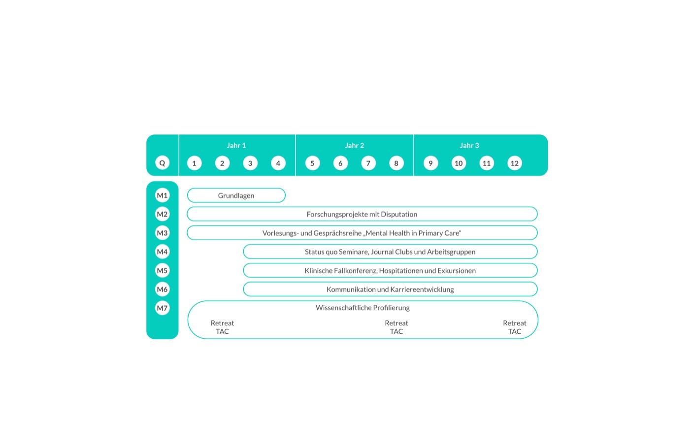 Die projektübergreifenden „Arbeitsgruppen“ (1 ECTS): AG „Diagnostik“ (A. Schneider) und AG „Behandlung“ (J. Gensichen) dienen der interdisziplinären Konsentierung von Forschungsinstrumenten und der Fortentwicklung der Forschungsschwerpunkte. Doktorand*innen und PIs planen transferierbare Ergebnisse, assoziierte Projekte und gemeinsame Forschungsanträge.